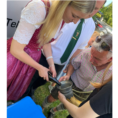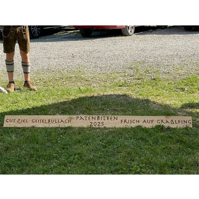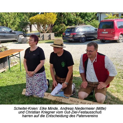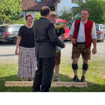 Zu den Festivitäten anläßlich des 125-Vereinsbestehens vom Schützenverein Gut Ziel gehört auch das traditionelle Patenbitten beim Schützenverein Frisch Auf Graßlfing. Seit den Gründerzeiten um 1900 sind diese beiden Vereine in Freundschaft und Kameradschaft miteinander verbunden und das wird gegenseitig bis heute gepflegt. Deshalb begeben sich die Geiselbullacher Schützen bei strahlendem Sonnenschein mit einem Musikanten nach Graßling, um mit dem offiziellen „Scheitel-Knien“ darum zu bitten, dass die Graßlfinger Schützen den Geiselbullachern beim 125-jährigen Jubiläum als Paten zur Seite stehen. Wie in der Tradition üblich, muß die Frisch-Auf-Vorstandschaft erst „augenzwinkernd“ diskutieren, bis sie sich zur Freude aller, zur Übernahme der Patenschaft „durchringen“ kann. Um den Gut Ziel Schützen die Wartezeit zur verkürzen, wird häufig das große Graßlfinger Trinkhorn gereicht. Der sonnige Nachmittag verflog bei gutem Essen in allerbester Stimmung. Erst ein aufkommendes Gewitter in den Abendstunden konnte das fröhliche Fest der Schützenkameraden beenden!