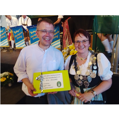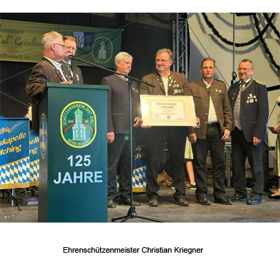 Der Schützenverein Gut Ziel Geiselbullach schaut mit viel Freude auf das gelungene 125-Jährige zurück! Rund 800 Gäste aus fast 40 Vereinen aus Olching und dem Schützengau Fürstenfeldbruck sind der Einladung am 29.6.25 gefolgt und erlebten bei strahlendem Sonnenschein ein großes Schützenfest nach bester Tradition - mit dem herzlichen Empfang der Verein, der hl. Messe, mit Blasmusik, Fahnenabordnungen, Festumzug und vielem mehr. Im Rahmen des Festaktes konnte 1. Schützenmeister Andreas Niedermeier, im Beisein des Gauvorstands Wolfgang Dietrich und Landesschützenmeister Christian Kühn, einige verdiente Mitglieder mit Ehrennadeln und Urkunden auszeichnen. Dazu gehörten auch Werner Minde, Wolfgang Mooshofer und Gerhard Wörl, die seit 40 Jahren als Fahnenabordnung fungierten (Ehrenabzeichen gold). Eine besondere Ehrung wurde auch Christian Kriegner zuteil: Er  hatte 25 Jahre lang, bis Anfang 2024, das Schützenmeister-Amt inne. Dieser große Einsatz wurde ihm mit der Ernennung als Ehrenschützenmeister gelohnt, die Christian Kriegner unter großem Applaus mit viel Freude entgehen nahm. Die Gut-Ziel-Vorstandschaft bedankt sich sehr herzlich bei allen Mitgliedern und Helfern für das Engagement im Verein und für die gute Zusammenarbeit rund um das Vereinsjubiläum.