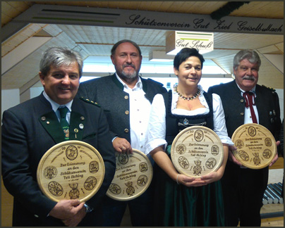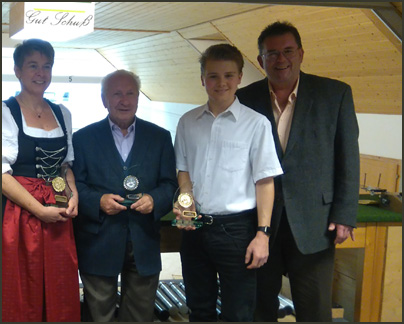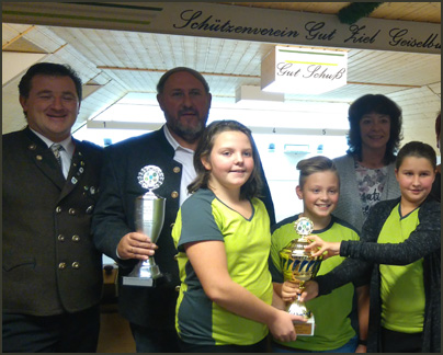 Im Rahmen der Gaumeisterschaften in Maisach wurde auch der Gaujugend-Wanderpokal ausgetragen. Es hatten sich 17 Mannschaften mit 68 Jungschützen daran beteiligt. Sieger wurden mit 743 Ringen die von ihrem Geiselbullaeher Schützenmeister Christian Kriegner präsentierten Gut-Ziel-Talente (v.I.) Fabian Westermann, Lena Motzer sowie Jasmin und Florian Kriegner. Auf den weiteren Plätzen folgten Parsberger Alling (723), Gemütlichkeit OJching (707) und Edelweiß Puch (697).