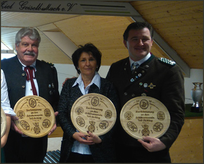 Für rund 30 Jahre(!) treuen Dienst zeichnete Schützenmeister Christian Kriegner die Fahnenabordnung des Schützenvereins Gut Ziel Geisebullach aus. Die Fahnenabordnung ist nicht nur treu und zuverlässig, so betont Kriegner in seiner Laudatio, die drei Männer organisieren sich selbst und entlasten somit auch die Vorstandschaft. Nahezu bei allen Gelegenheiten ist die Geiselbullach Fahne präsent, ob Volksfesteinzug, Fronleichnam oder Volkstrauertag… Im Rahmen der Weihnachtsfeier am 27.11.16 wurde Fahnenträger Werner Minde mit seinen Fahnenbegleitern Gerhard Wörl und Wolfgang Mooshofer mit dem Gau-Ehrenabzeichen in Gold nebst Urkunde und Blumen geehrt. Gau-Schützenmeister Wolfgang Dietrich und stellvertretender Bürgermeister Olchings Robert Meier vollzogen die Ehrung in würdigem Rahmen.