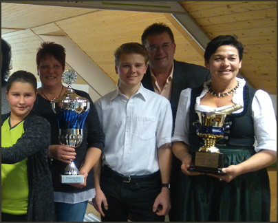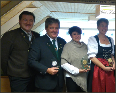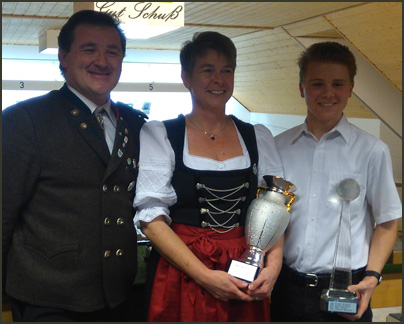 Foto: v.l.n.r. Hintere Reihe: Die Valentinssieger: Roland und Michaela Motzer, Anja Deutschbein.´Florian Kriegner mit dem Manderl-Weiberl-Pokal, gestiftet von 1. Schützenmeister Christian Kriegner (rechts).