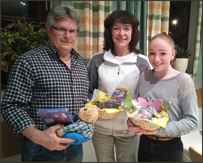 Ein Woche vor Ostern ließ sich in Geiselbullach der Osterhase schon blicken. Beim Osterschießen am 7.4.17 gab es gehaltvolle Osternester zu gewinnen und einen fröhlichen launigen Abend zu verbringen. Die Sieger des Abends heißen (v.l.n.r.) Mike Wagner, Anja Deutschbein und Lena Motzer.